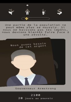 Pour initier ce débat, l’idée est venue de nous inspirer de « Reigns » (et de ses nombreuses variantes), un jeu mobile où le joueur incarne un roi, et doit prendre des décisions binaires (oui/non) sur des problématiques du royaume : « le blé vient à manquer, réquisitionnons-nous les stocks de nourriture pour l’armée, ou pour le peuple ». Ce qui est intéressant dans ce genre de dilemmes, c’est qu’il n’y a pas de choix idéal et, au-delà de l’impact court terme (satisfaction du peuple ou de l’armée), il est aussi important de réfléchir à l’impact de ce choix à long-terme (grèves, désertion de l’armée, …).
