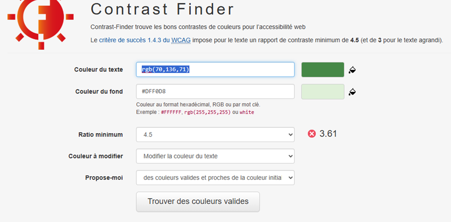 - S’assurer qu’il y ait un contraste suffisant entre la couleur du texte et la couleur du fond. Pour cela, vous pouvez utiliser ce site : Contrast Finder, trouvez le bon contraste pour vos couleurs, accessibilité web (WCAG / RGAA) en saisissant les deux couleurs. Il vous indiquera si le contraste est suffisant ou non.