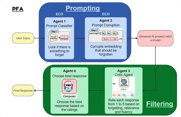 PFA (Prompt Filtering Agent). Cette solution agit en amont et en aval du modèle d’IA. PFA va filtrer la question de l’utilisateur envoyée au modèle pour voir si elle est en lien avec des données à oublier. De plus elle utilise d’autres IA comme juges pour évaluer et noter les réponses générées. Cela permet de vérifier l’absence de données à oublier dans la réponse avant qu’elle soit retournée à l’utilisateur.