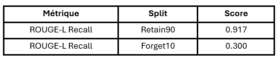 - ROUGE-L et Probability – mesure l’efficacité de l’oubli. ROUGE-L calcule la similarité entre la réponse générée par l’IA et la référence (si ces deux textes se ressemblent alors le score est élevé) ; plus le score baisse sur les contenus à supprimer, plus l’oubli est efficace.