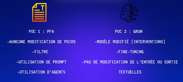 En résumé, le choix entre GRUN et PFA doit se faire en fonction des priorités du cas d’usage : GRUN est à privilégier si l’oubli complet est l’objectif principal (données sensibles, droit à l’oubli), tandis que PFA est plus adaptée lorsqu’il est essentiel de préserver au maximum les connaissances utiles du modèle (secteurs scientifiques, santé, éducation).