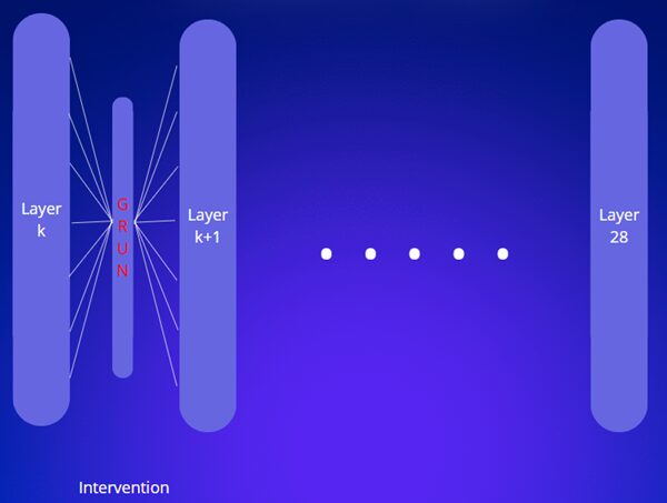 Pour cette raison, nous avons choisi la solution GRUN (Gated Representation UNlearning) qui offre une approche intéressante. Il s’agit d’une intervention. La solution va se greffer à l’intérieur du modèle entre deux couches, il va intercepter les informations transmises d’une couche à la suivante puis les modifier en cas de besoin avant de les transmettre à la suivante.
