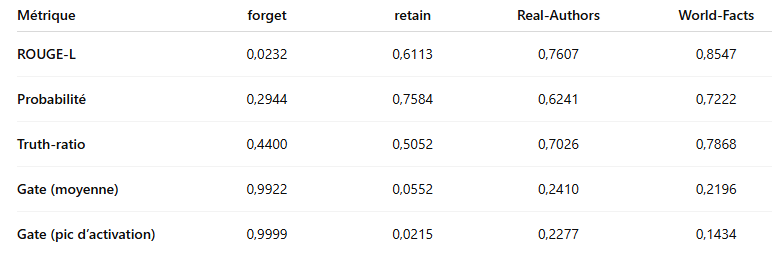 En combinant ces indicateurs – diminution de ROUGE-L et de probabilité sur les données oubliées, stabilité de ROUGE-L retain et du truth ratio sur les données conservées, et sélectivité des gates – nous obtenons une évaluation robuste qui répond aux questions : le modèle a-t-il vraiment oublié ce que l’on voulait supprimer, et a-t-il conservé le reste de son savoir ?